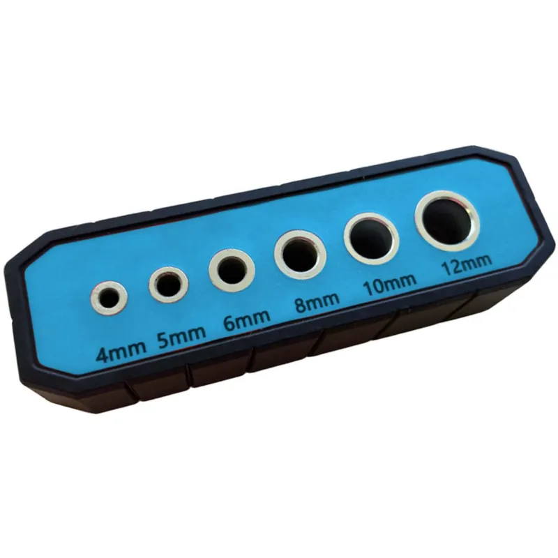 Praktický vodicí přípravek pro vrtání v různých průměrech (4–12 mm). Pogumovaný povrch pro pevný úchop a přilnutí k obrobku. Boční drážky označují středy předznačených vrtacích otvorů a zajišťují přesnou práci. Drážka ve tvaru písmene „V“ na spodní straně přípravku zajišťuje pevné uchycení k rohům a kulatým obrobkům.