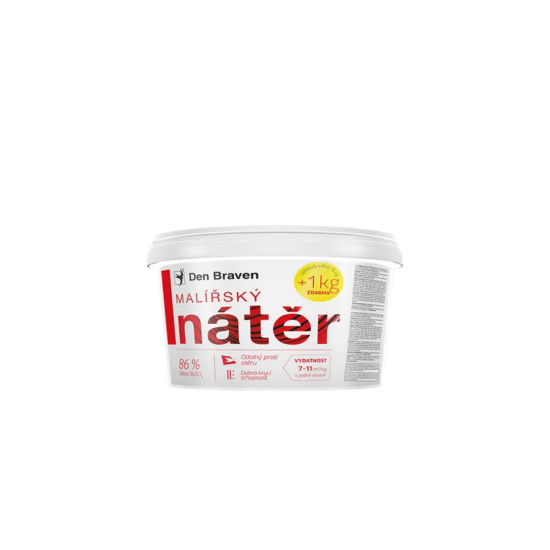 Pro klasické interiérové nátěry hladkých i štukových omítek. Nátěry dřevotřískových, dřevovláknitých a cementotřískových desek. Klasické nátěry vápenocementových omítek, cihelného zdiva a betonových panelů. Překrývání akrylových tmelů Den Braven za účelem dosažení shodného vzhledu s okolním malířským nátěrem. Vhodný pro nátěry společenských místností. Vydatnost 7 – 11 m 2 /kg. Doba schnutí 2 hodiny.