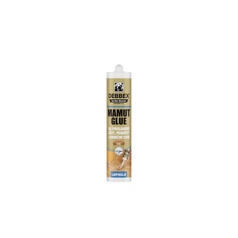 MAMUT GLUE na podlahové lišty je moderní „High Tack“ hmota na bázi MS polymerů vykazující okamžitou fixaci spoje bez použití svěrek a podepření. Nosnost po vytvrzení 22 kg/1 cm 2 . Skvělá přilnavost ke dřevu, MDF lištám, deskovým materiálům jako OSB desky, MDF, MFP, DTD a HDF desky, hobře, spárovka, laťovka, parapety, schodnice, BIO desky, sololak, sololit, akulit, překližka truhlářská, překližka stavební, ratan a bambus. Výborně přilne k nerezu, hliníku, mědi, zdivu, omítce, kamenu, sádrokartonu, keramice, sklu apod. Neobsahuje rozpouštědla a silikon.